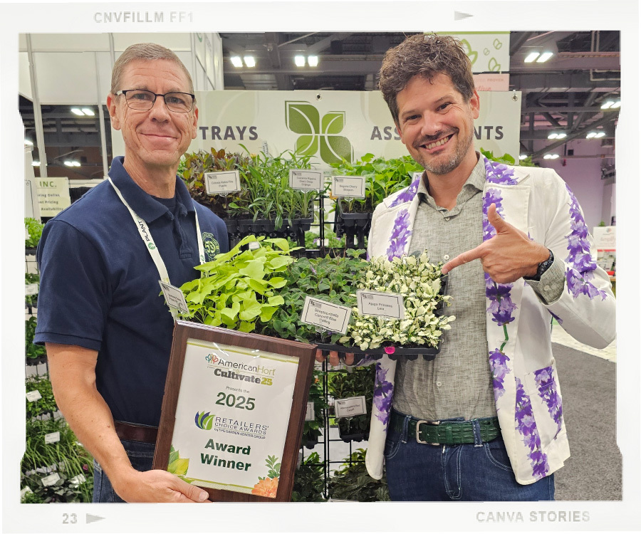 After touring the show, The Garden Center Group garden retailers selected 15 products at Cultivate’25 which they felt would bring excitement and noteworthy interest to their stores in the coming season. We’re proud to say that one of the Retailers’ Choice Awards™ was presented to our Princess Leia Ajuga thanks to its appearance in the North Carolina Farms booth. This Ajuga has a dramatic contrast on uniquely patterned leaves with green and white variegated foliage that is crowned with deep purple flowers in spring. Pictured with the award and Princess Leia is Mick Donahue of North Carolina Farms and our very own Peter van Rijssen.